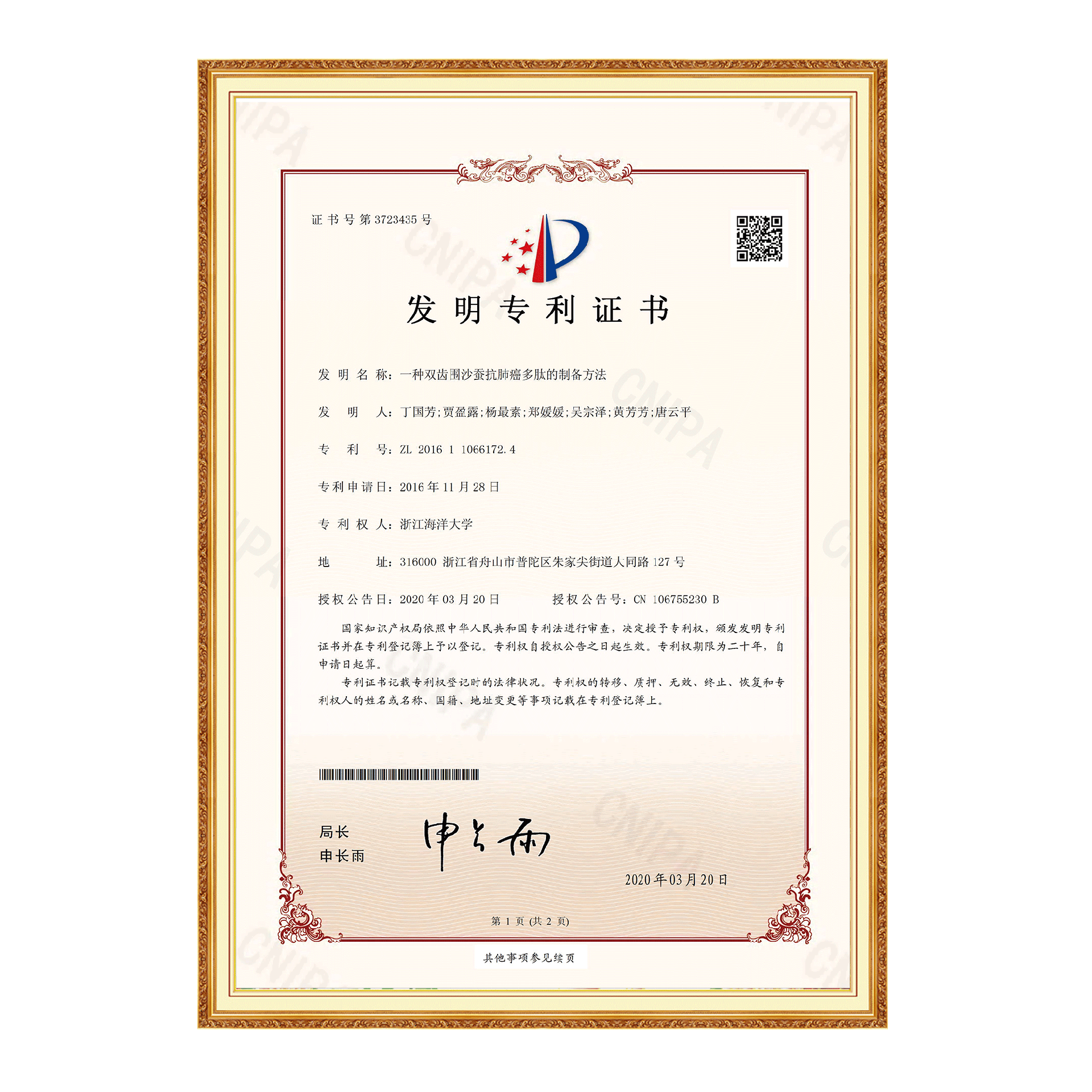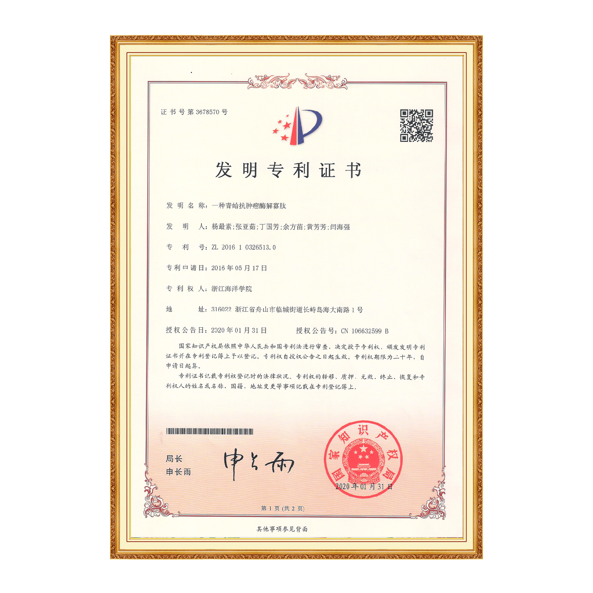 摘要:本发明的目的是提供一种制备高特异性褐藻寡糖的酶,所述酶的氨基酸序列为SEQ ID NO:1。本发明酶用于降解褐藻胶来制备褐藻寡糖。本发明所筛选获得的蛋白酶在酶解褐藻胶时获得特异性的产物,从而使反应的副产物更少,有利于后续更方便的通过胶柱层析来分离单一寡糖,从而有效的提高了制备褐藻寡糖的效率,节省了成本。